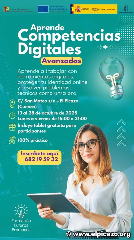 Apúntate a los Talleres de Competencias Digitales en El Picazo, del 13 al 28 de octubre (teléfono para apuntarse en cartel adjunto). Requisitos: